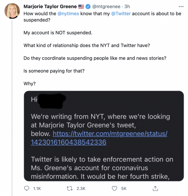 “How would the @nytimes know that my @Twitter account is about to be suspended?” Greene tweeted. “My account is NOT suspended. What kind of relationship does the NYT and Twitter have? Do they coordinate suspending people like me and news stories? Is someone paying for that? Why?”