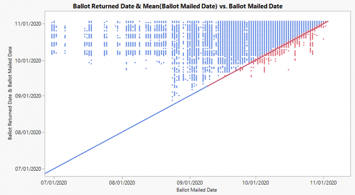 In the below plotted graph, you will see all of the “suspicious” ballots – meaning those that were returned before being mailed out, the same day, or at the latest the following day – listed in red. In total, V_C_435 identified 109,421 of these suspicious ballots: