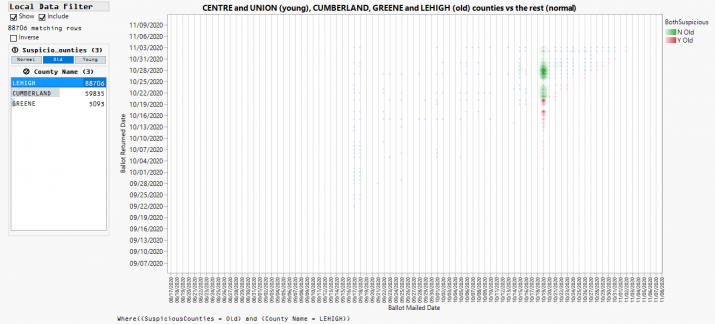 Other strange details parsed out in the thread include sudden bursts of “suspicious” ballots from certain age groups and counties. In the counties of Centre and Union, for instance, large drops of suspicious ballots arrived from mostly younger voters, while in Cumberland, Greene, and Lehigh, suspicious ballots came from older folks.