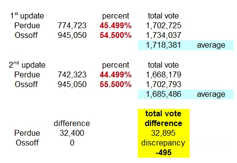 The percentages still add up (56% = 44% = 100%), but the mathematical theory articulated above again breaks down. Perdue’s and Ossoff’s vote tallies, when divided by their percentages, should yield the identical number and, once again, they don’t.