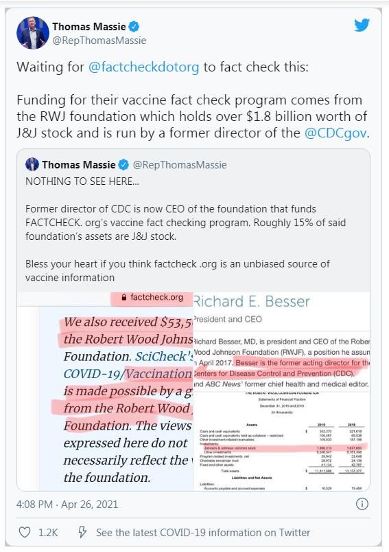 In any other regulated field, FactCheck.org is a criminal organization deliberately pushing vaccines and is instrumental in shutting down any opposition. This criminal organization under TRICO statutes is headed by a former CDC director, which is once again a conflict of interest. He is being paid by the drug lobby indirectly. Facebook partnered COVID fact-checker is an outrageous fraud. FactCheck.org was funded by the same $1.9 billion vaccine lobby. A US congressman Thomas Massie has pointed out a fact that a COVID-19 vaccination “fact-checking” project conducted by a Facebook-partnered website was actually funded by a group that holds $1.9 billion in Johnson & Johnson stock.