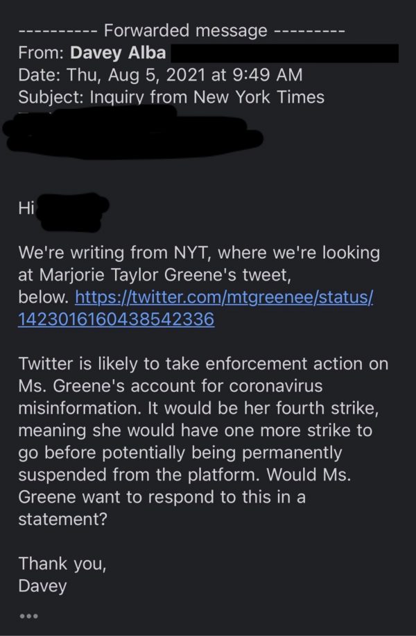 In the email, the reported said that the New York Times is “looking at” one of Greene’s tweets and that Greene’s account would likely face enforcement action for “coronavirus misinformation.”