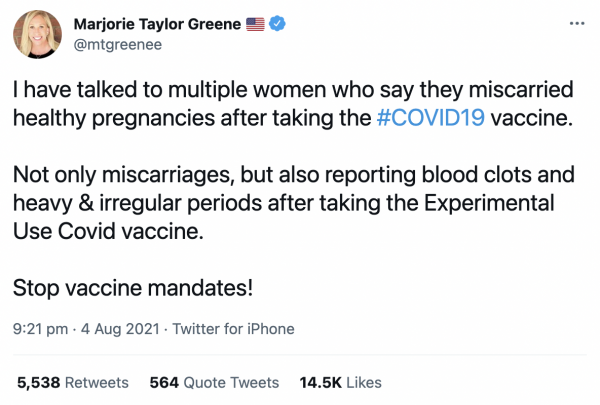 In the tweet that the New York Times flagged for alleged coronavirus misinformation, Greene called for an end to vaccine mandates and said she had “talked to multiple women who say they miscarried healthy pregnancies after taking the #COVID19 vaccine…not only miscarriages, but also reporting blood clots and heavy & irregular periods after taking the Experimental Use Covid vaccine.”